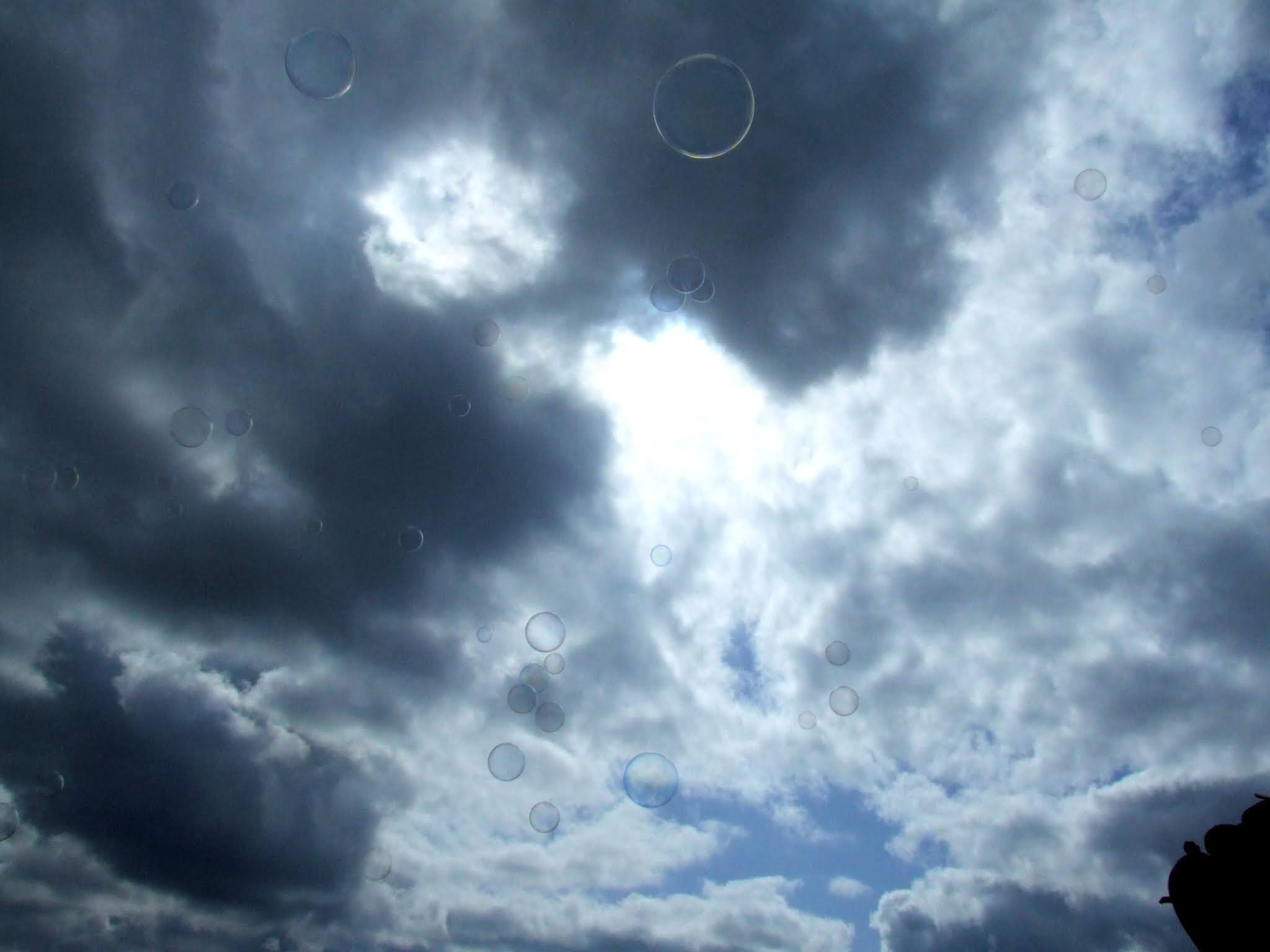 真っ青な空と白い雲に、シャボン玉が飛んでいる風景の写真素材です。どこかファンタジックで非日常な印象を与えます。